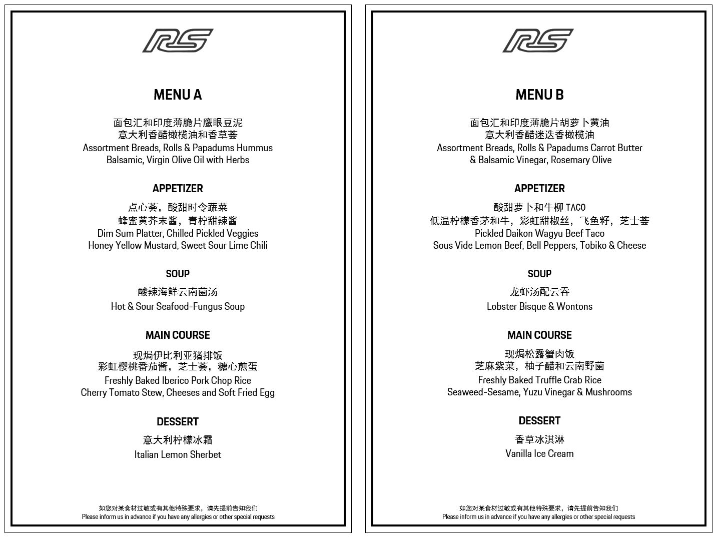 * 以上价格已包含 RS 餐厅中的软饮、茶和咖啡。